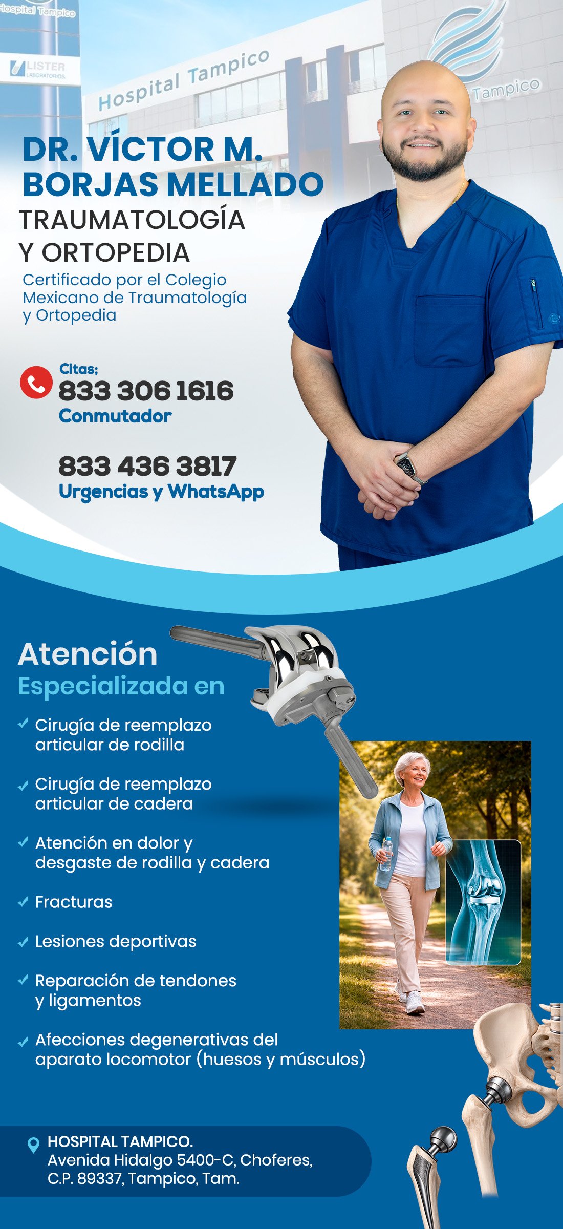 Cirujano traumatólogo y ortopedista con amplia experiencia en cirugía de reemplazo de rodilla y cadera.